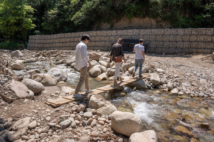 В ходе реализации проекта авторы также отказались от классических скамеек в пользу более экологичных вариантов, длинных конструкций из камней и дерева и деревянных лежаков.