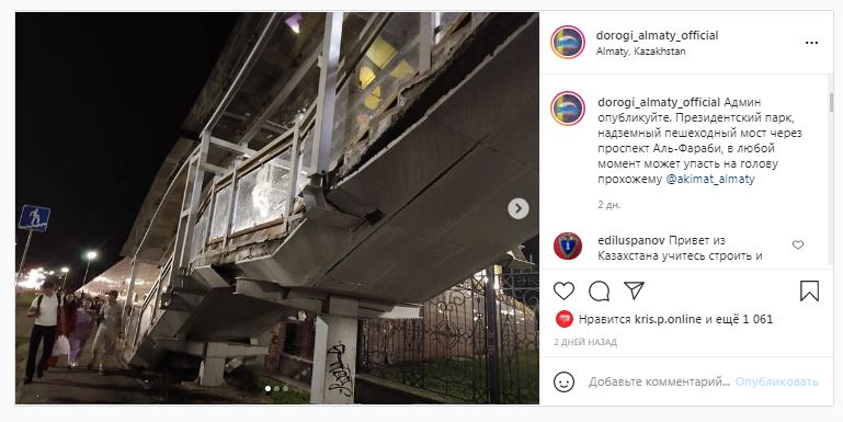 — По вопросу ремонтных работ надземного пешеходного перехода у Парка Первого Президента РК сообщаем, что силами подрядной организации указанные вами дефекты устранены, — сообщили в акимате.