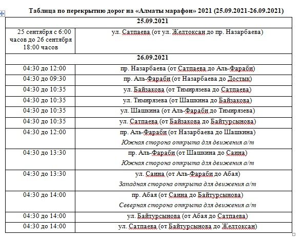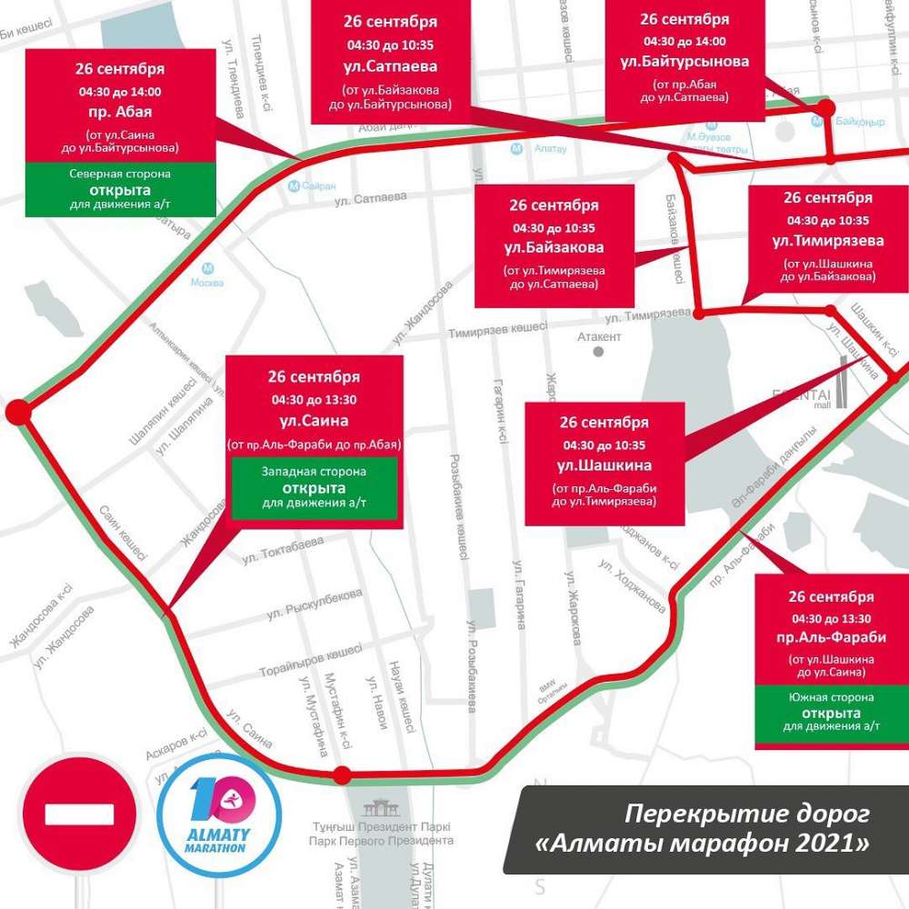 Сообщается, что 9:00 часов 25 сентября по 18:00 часов 26 сентября будет частично перекрыто движение на дорогах в местах прохождения дистанций марафона. По мере прохождения дистанции спортсменами трассы будут открываться, передает BaigeNews.kz со ссылкой на оргкомитет марафона.