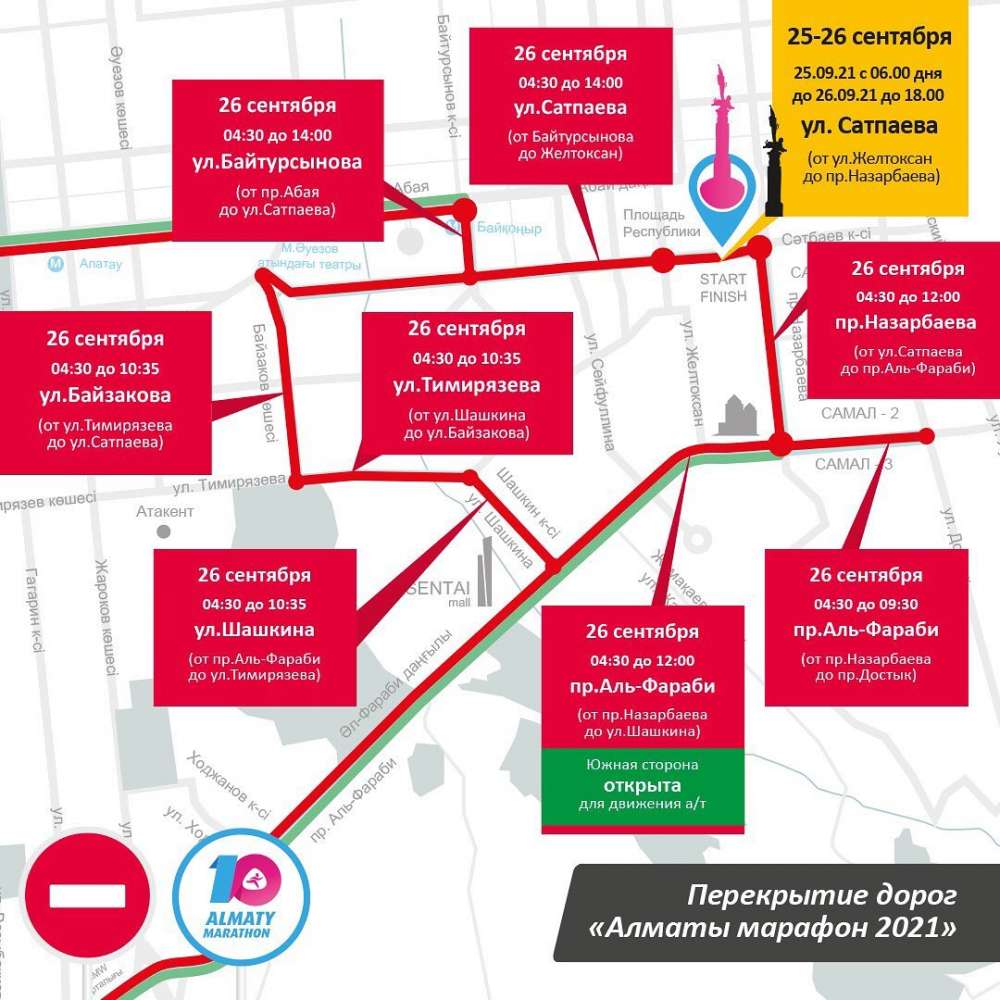 Старт и финиш марафона пройдет на Площади Республики, поэтому по улице Сатпаева от улицы Желтоксан до проспекта Назарбаева будут перекрыты обе полосы движения с 6:00 часов 25 сентября до 18:00 часов 26 сентября.