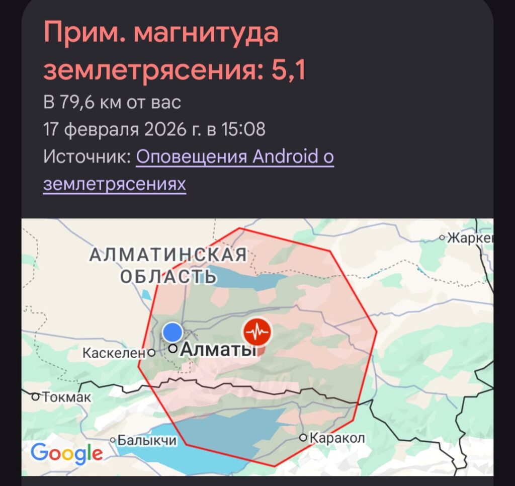 — Сейсмических станций ТОО «ННЦСНиИ» МЧС РК 17 февраля 2026 г. в 15 час 09 мин по времени Астаны зарегистрировано землетрясение. Очаг землетрясения располагается на территории Казахстана в 74 км. на восток от г. Алматы. Полученные данные в обработке Сведений по пострадавшим и разрушениям не поступало, — сообщили в МЧС РК.