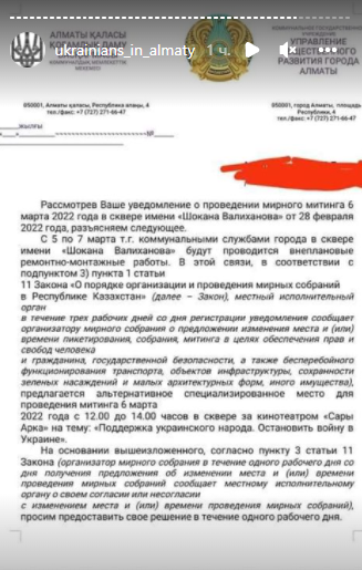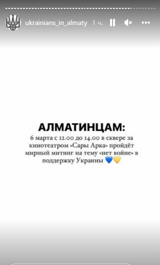 На странице в Instagram под названием "Украинцы в РК" сообщили о проведении мирного митинга в Алматы против войны, передает медиа-портал Caravan.kz.