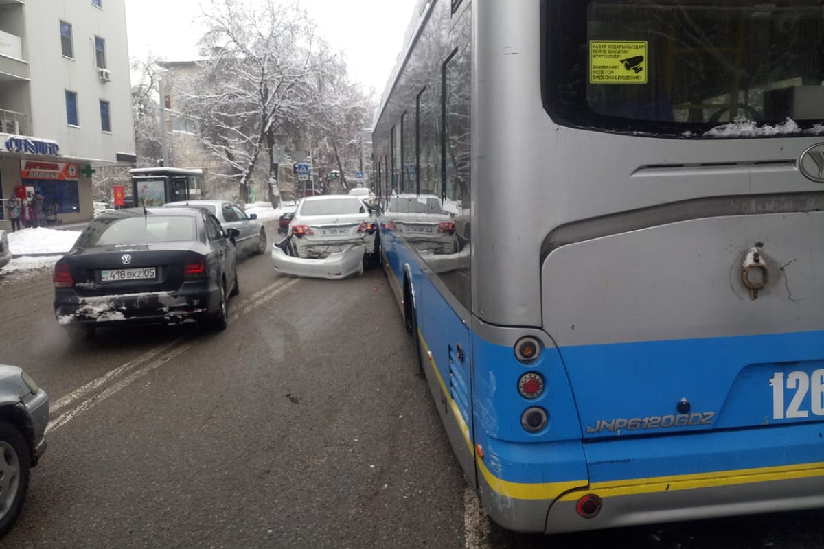 В Алматы на пересечении улиц Байзакова и Карасай батыра произошло массовое ДТП с участием троллейбуса, передает Azattyq Rýhy.
