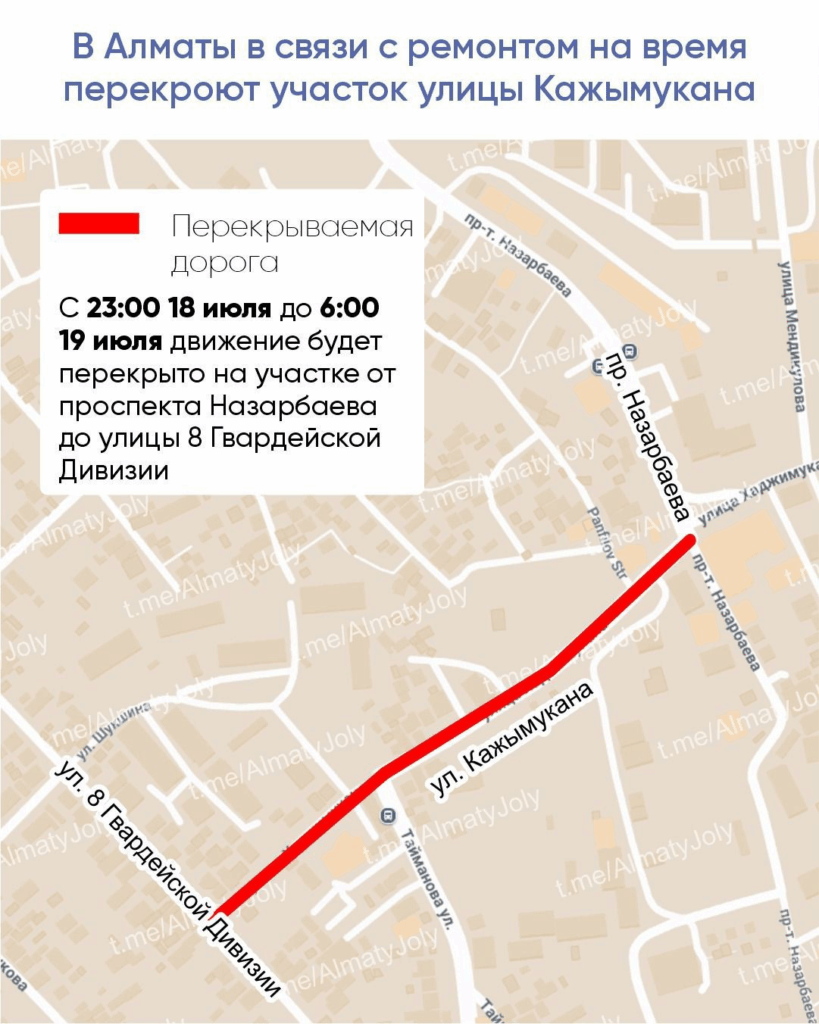 Так, с 23:00 18 июля до 6:00 19 июля движение будет перекрыто на участке от проспекта Назарбаева до улицы 8 Гвардейской Дивизии.
