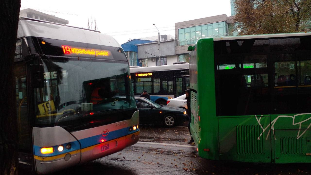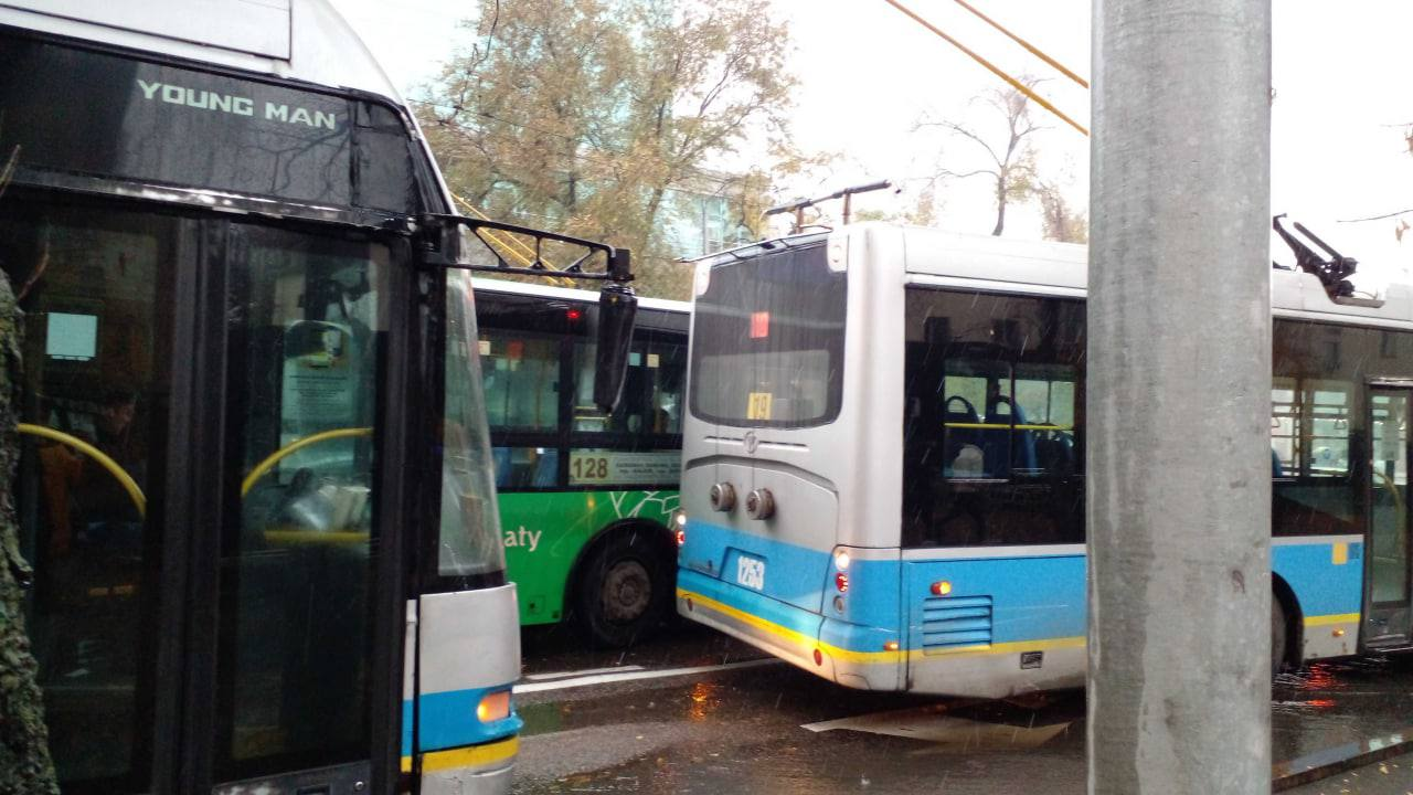 "На проспекте Абая столкнулись троллейбусы и автобусы. Всего четыре единицы транспорта. Из-за аварии оказалась перекрытой дорога, транспорт стоит в пробке. Сейчас в Алматы идёт снег с дождём. Акимат города обращался ранее к водителям с просьбой быть бдительнее на дорогах", — подписали фотографии.