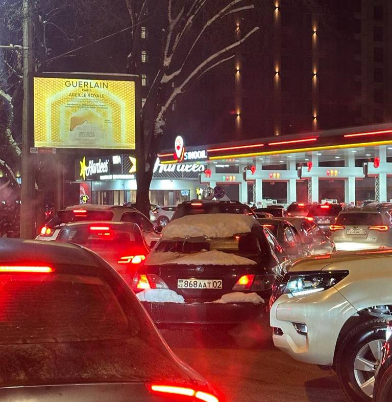 Очереди на заправках и пробки зафиксировали жители Алматы, сообщает Tengrinews.kz.