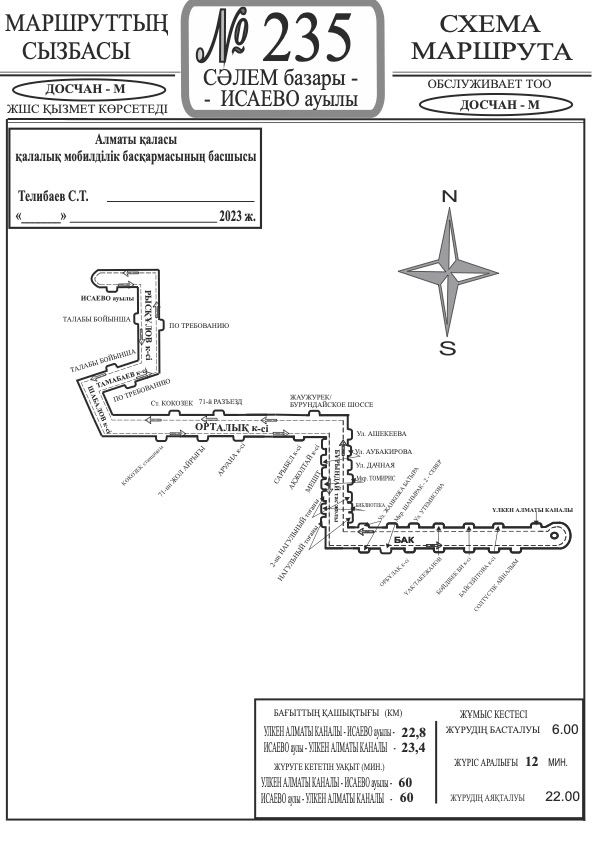 Маршрут №235 курсирует между рынком "Салем" и поселком Исаев в Илийском районе.