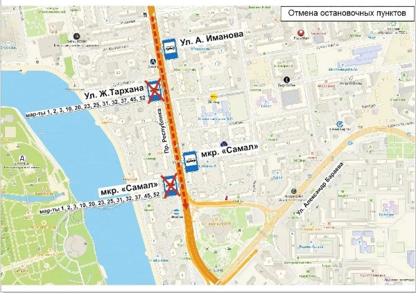 — В связи с этим на данных остановочных пунктах маршруты №№ 1, 2, 3, 10, 20, 23, 25, 31, 32, 37, 45, 52 не будут осуществлять посадку/высадку пассажиров. Посадка и высадка пассажиров временно осуществляется на ближайших остановочных пунктах, — говорится в сообщении.