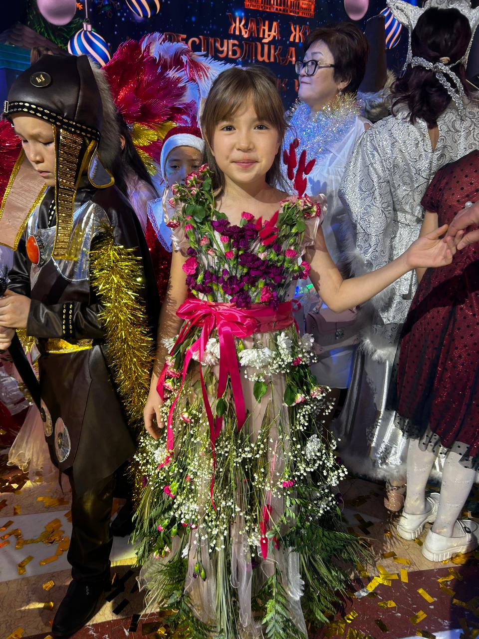 На новогодний праздник пришли более 100 школьников от 8 до 12 лет со всех регионов страны. Ребята, отличившиеся успехами в учебе, а также в творческих, интеллектуальных и спортивных состязаниях. Среди участников мероприятия десятилетняя Малика Мухамеджанова. Ученица школы-гимназии №2 села Смирново Аккаинского района Северо-Казахстанской области специально для этого мероприятия своими руками сшила наряд из 100 живых роз.