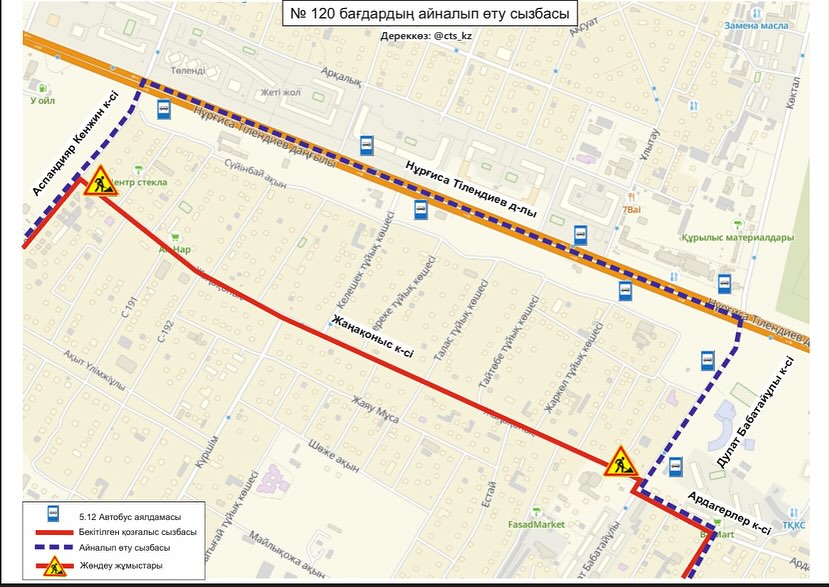 Для автобусного маршрута №120 объезд организуют по улице Кенжина, проспекту Тлендиева с поворотом на улицы Бабатайулы и Ардагерлер.