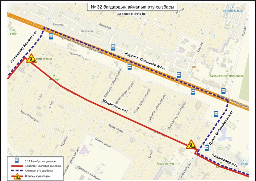 Автобусный маршрут №32 будет объезжать закрытый участок по улице Аспандияр Кенжин, проспекту Нургиса Тлендиева с поворотом на улицу Дулата Бабатайулы и проезжает по улице Ардагерлер.