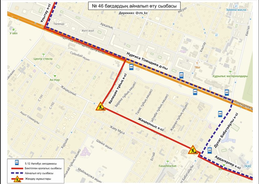Обход для маршрута №46 организуют по улице Улытау, проспекту Тлендиева с поворотом на улицы Бабатайулы и Ардагерлер.