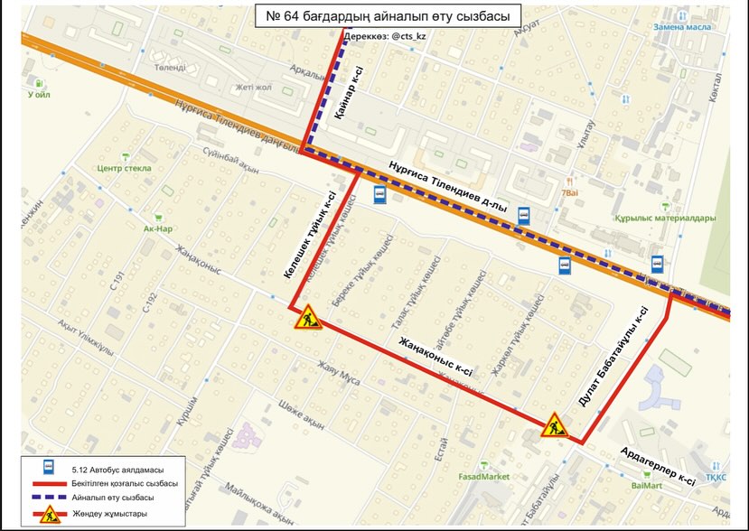 Автобусный маршрут №64 будет следовать по улице Кайнар с поворотом на проспект Тлендиева.