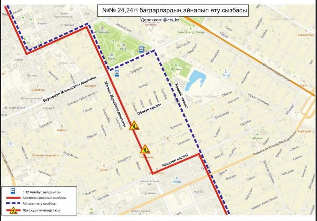 Обход для маршрутов №24, 24H организуют по проспекту Момышулы и улице Кордай.