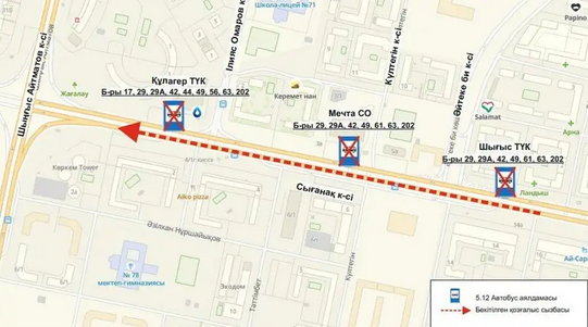 Также временно отсутствуют остановки на «ЖК Шығыс», «БЦ Мечта», «ЖК Кулагер» по улице Сыганак, где проходят маршруты автобусов № 17, 29, 29А, 42, 44, 49, 56, 61, 63, 202.
