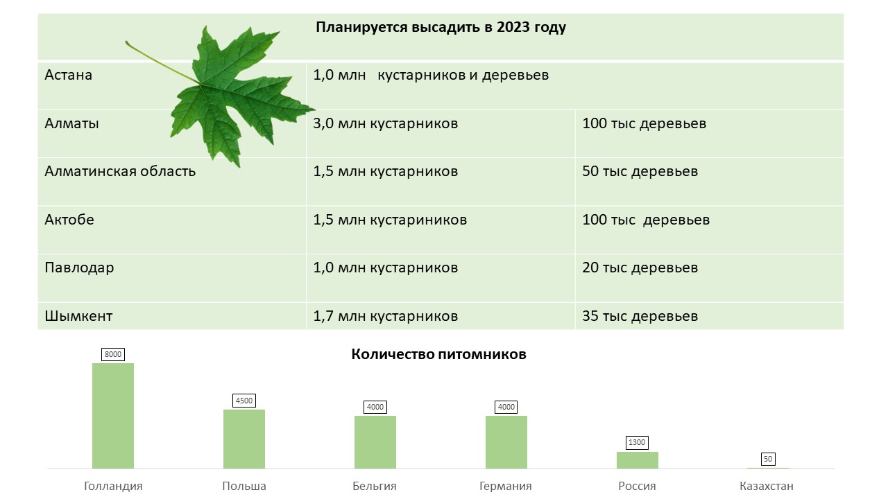 Он также отметил, что в Казахстане сейчас идет активная реализация проектов по строительству жилых комплексов, парков и новых агломераций. И в ближайшее время Казахстан может столкнуться с нехваткой питомников.