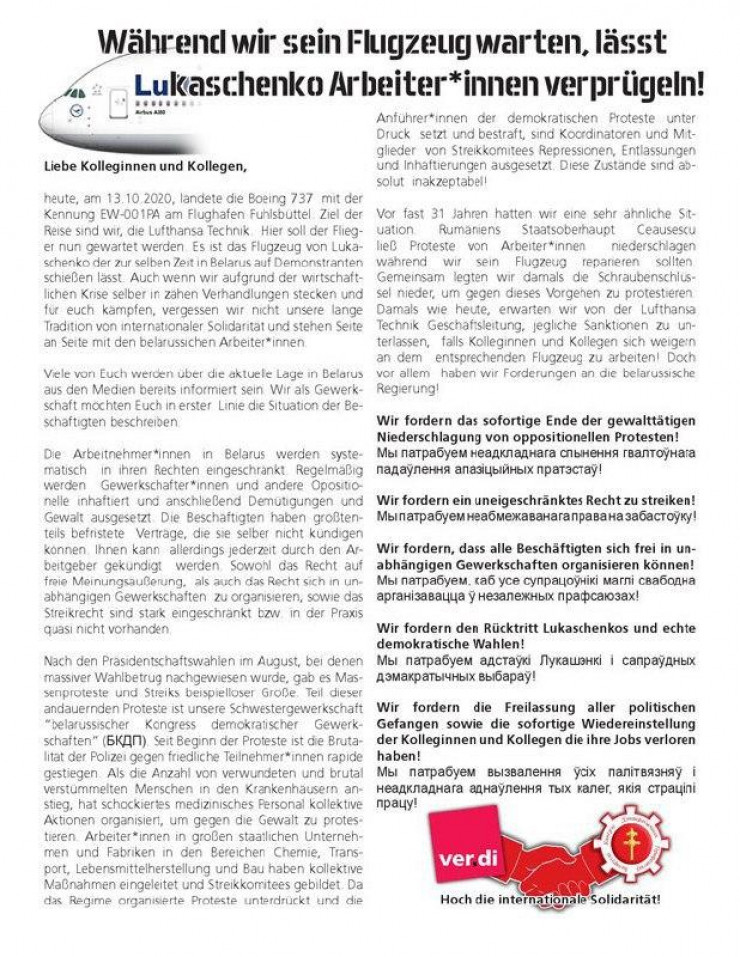 — Мы, профсоюзные активисты компании Lufthansa Technik, не забываем нашу давнюю традицию международной солидарности и стоим бок о бок с белорусскими рабочими, — говорится в листовке профсоюза компании.