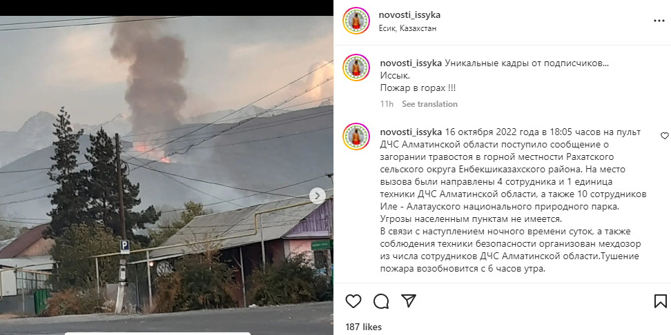 В посте сообщили, что 16 октября 2022 года в 18:05 часов на пульт ДЧС Алматинской области поступило сообщение о загорании травостоя в горной местности Рахатского сельского округа Енбекшиказахского района.