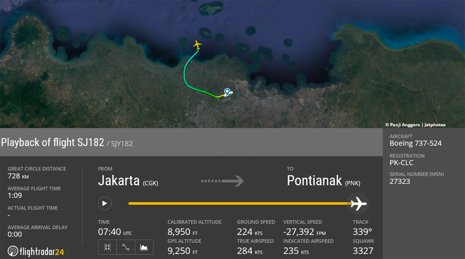 — Сигнал ADS-B с рейса SJ182 был потерян в 07.40.27 по времени UTC. Самолет летел из Джакарты в Понтианак в Индонезии, — говорится в сообщении сервиса.