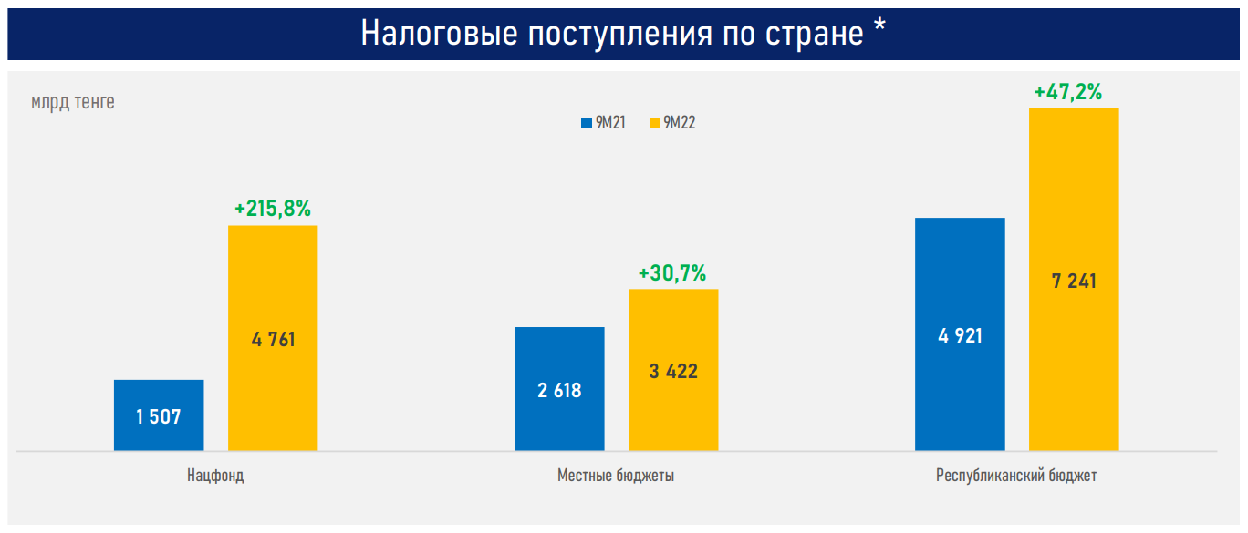За январь-сентябрь 2022 г. было собрано 15,4 трлн тенге налогов, что на 71 %, или 6,4 трлн тенге выше в сравнении с аналогичным периодом прошлого года.