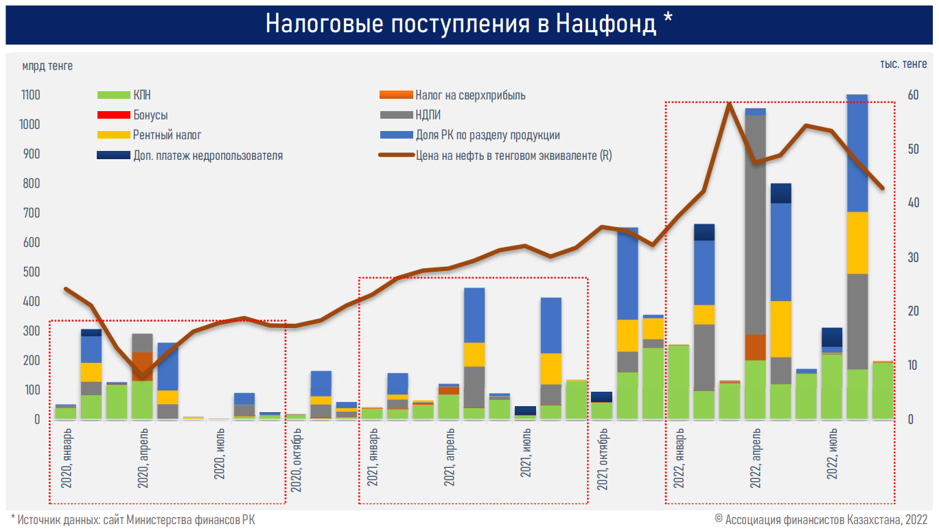 Более половины (51 %) прироста приходится на отчисления в Нацфонд, в частности, по НДПИ (+1,1 трлн тенге), КПН (+1 трлн тенге) и доле РК по разделу продукции (+0,6 трлн тенге). Таким образом, за 3 месяца до окончания года исполнение плана (на 2022 г.) по налоговым сборам составило 86 % в сравнении с 76 % годом ранее.
