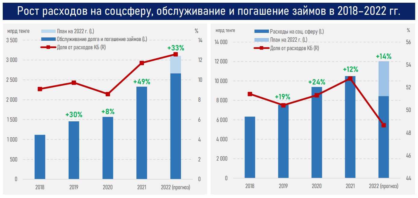 Высокий риск рецессии мировой экономики на фоне глобального повышения ставок делает ориентиры по ценам на нефть (85 долл. за баррель) и курсу USD/KZT (470) на 2023 год мало возможными. Это приведет к тому, что бюджетное правило и объёмы изъятий из Нацфонда (-1,4 трлн тенге) могут быть неисполнимы. Причина этого — рост социальных расходов и льготное кредитование. Такие расходы приводят к увеличению потребительского спроса, росту денежной массы и, как следствие, к более высокой инфляции и долговой нагрузке на бюджет.