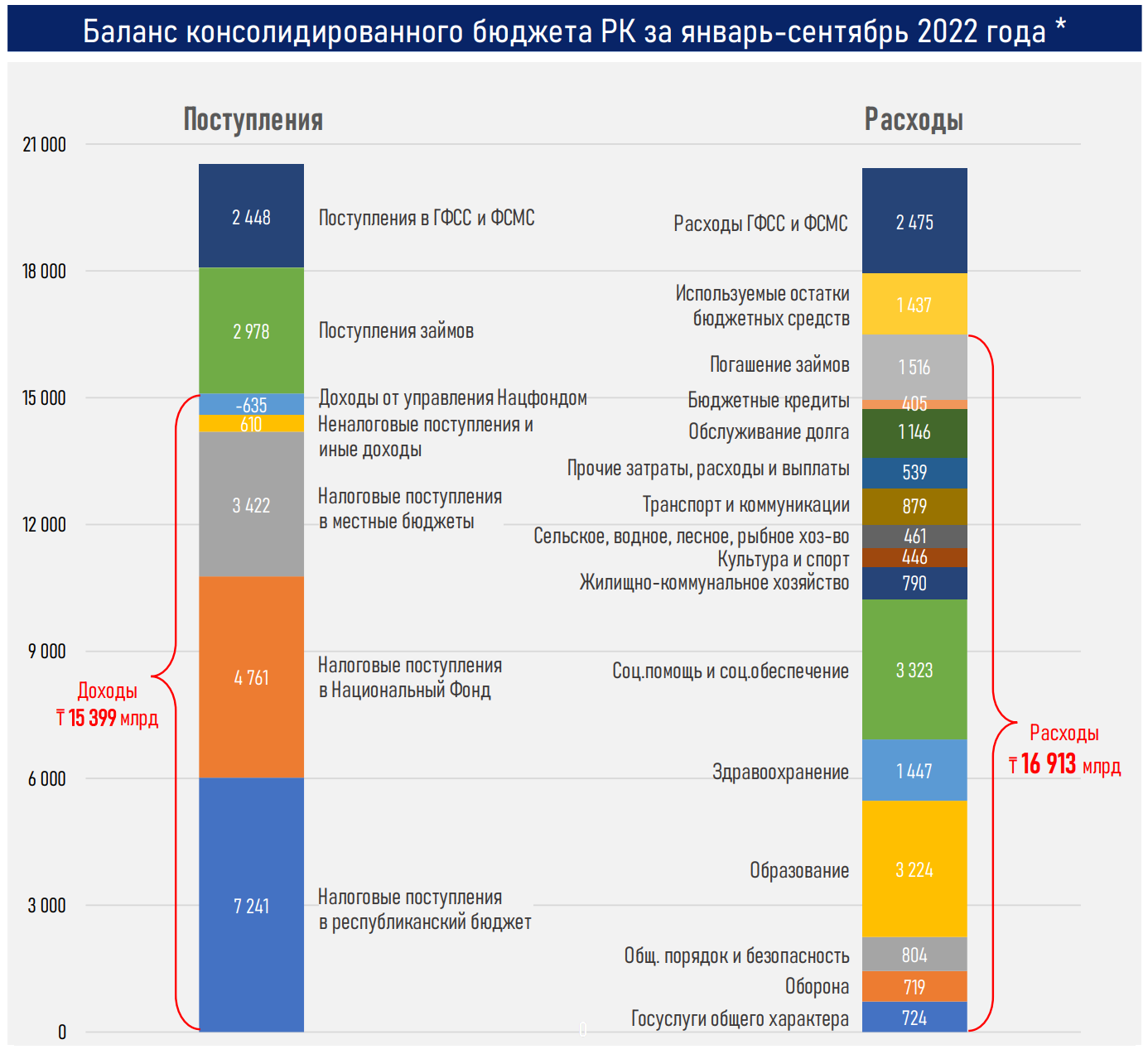 Расходы консолидированного бюджета выросли на 19 %, или 2,7 трлн тенге – до 16,9 трлн тенге, превышая доходную часть на 10 %, или 1,5 трлн тенге.