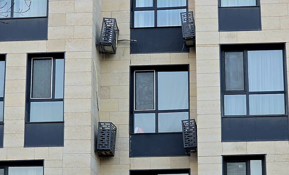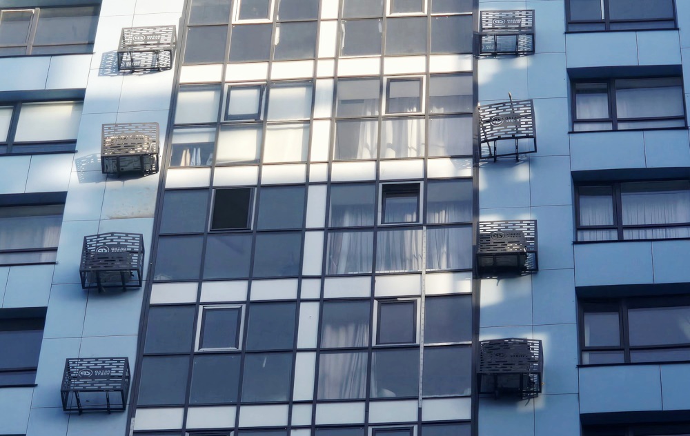 ЖК Adele. Под этими кондиционерами нет козырьков или других препятствий. Если во время падения внизу окажется человек – он может получить серьезные травмы.