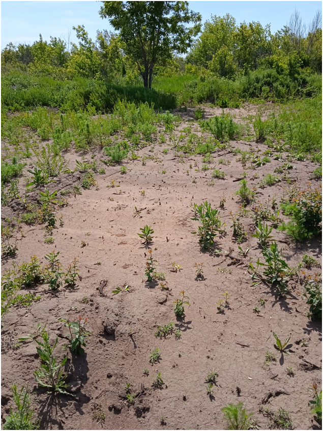 А вот здесь украдена почва. По редкой и низкорослой траве видно, что почвенного слоя здесь нет.