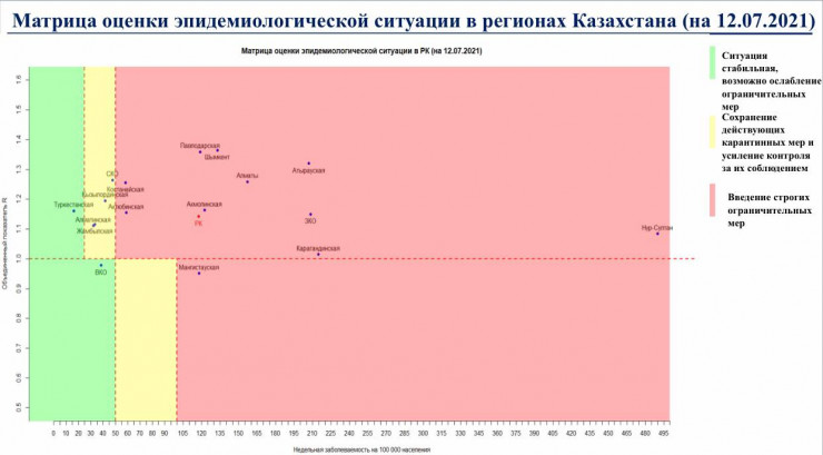 12 июля в "красной" зоне: города Нур-Султан, Алматы, Шымкент, а также Акмолинская, Актюбинская, Атырауская, Западно-Казахстанская, Карагандинская, Костанайская, Мангистауская и Павлодарская области.