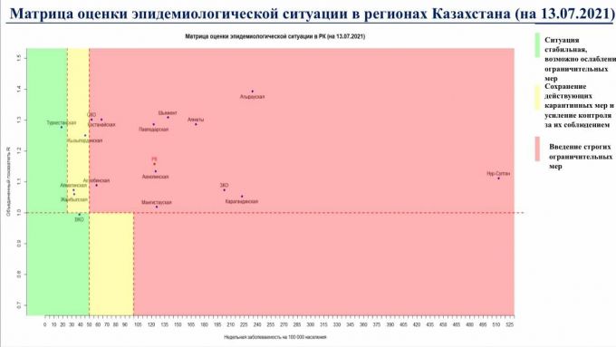 Матрица оценки эпидемиологической ситуации в регионах Казахстана на 13 июля 2021 года, сообщает Caravan.kz