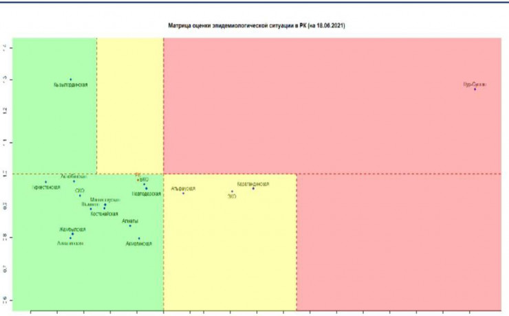 Согласно матрице оценки эпидемиологической ситуации в регионах Казахстана на 18 июня, в "красной" зоне находится Нур-Султан, передает Caravan.kz со ссылкой на МВК.