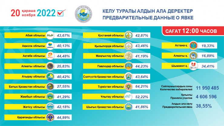 Наибольшая явка наблюдается в Туркестанской области. Там проголосовало уже более 64 процента граждан. Наименьшая явка отмечена в Алматы — 16,89 процента.