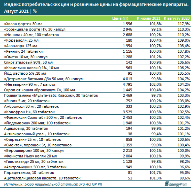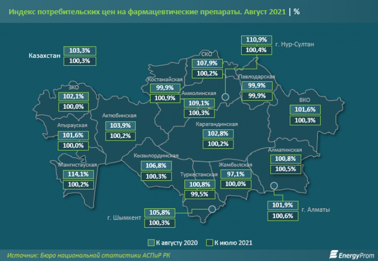 Сильнее всего цены на препараты в годовой динамике выросли в Мангистауской области — на 14,1 процента. Значительно подорожали лекарства также в Нур-Султане — на 10,9 процента и в Акмолинской области — на 9,1 процента.