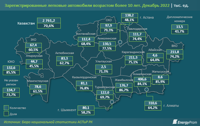 Сообщается, что треть легковых машин старше 10 лет ездит в трёх регионах: в Алматинской области (406,6 тыс. ед.), в Алматы (310,6 тыс. ед.) и в ВКО (211,8 тыс. ед.). Меньше всего их в Атырауской области и Астане, там их менее 50%.