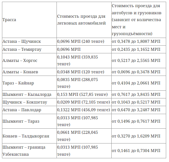 Стоимость их составит 1 МРП и от 20 до 100 МРП соответственно. Также они смогут купить месячный абонемент для автобусов и грузовиков по цене от 2 до 10 МРП.
