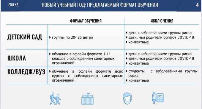 — В новом учебном году детские сады будут работать в штатном режиме с наполняемостью групп 20-25 детей. В школах обучение с 1-го по 11-й класс будет в офлайн-формате с соблюдением жестких санитарных ограничений. Также в офлайн-формате будут учиться все курсы колледжей и вузов, — сказал глава минобразования на заседании правительства, передает Zakon.kz.