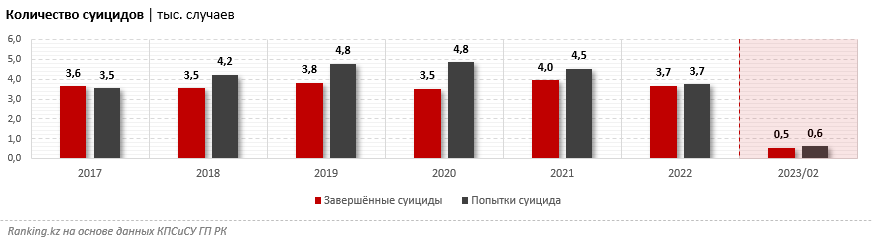Примечательно, что, в отличие от прошлых лет, количество попыток суицида практически совпадало с числом завершённых трагических случаев: те же 3,7 тыс. (разница всего в 65 случаев). Это тоже один из самых низких показателей за последние пять лет. Годом ранее таких попыток было значительно больше: 4,5 тыс.