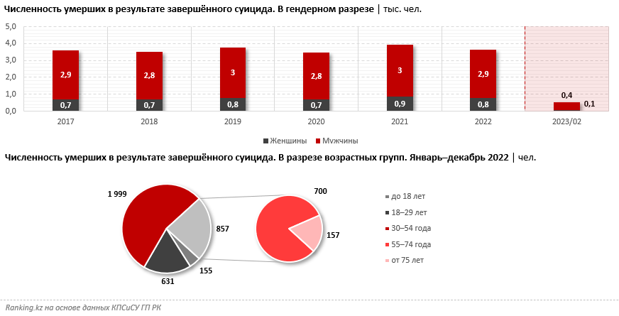 Динамика в минус 7 % складывается только из-за исключительно высокого числа самоубийств в 2021 году. В текущем году смертность от самоубийств также снижается. За январь-февраль 2023 года покончили с жизнью 526 казахстанцев – на 5 % меньше, чем за аналогичный период прошлого года.