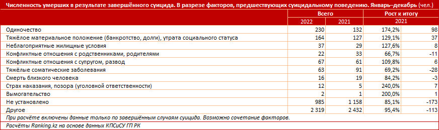 Отмечается и рост количества самоубийств из-за тяжёлого материального положения (164 случая, против 127 случаев в 2021 году) и неблагоприятных жилищных условий (37 случаев, против 29 случаев годом ранее). Чаще всего в полицейских отчётах такие стресс-факторы указывали при гибели мужчин (77 %). Сложные отношения со второй половиной или болезненный развод подтолкнули к самоубийству 67 человек, в 2021 году был 61 подобный случай. Почти столько же казахстанцев – 63 человека – погибли, так как предпочли смерть жизни с тяжёлой болезнью.