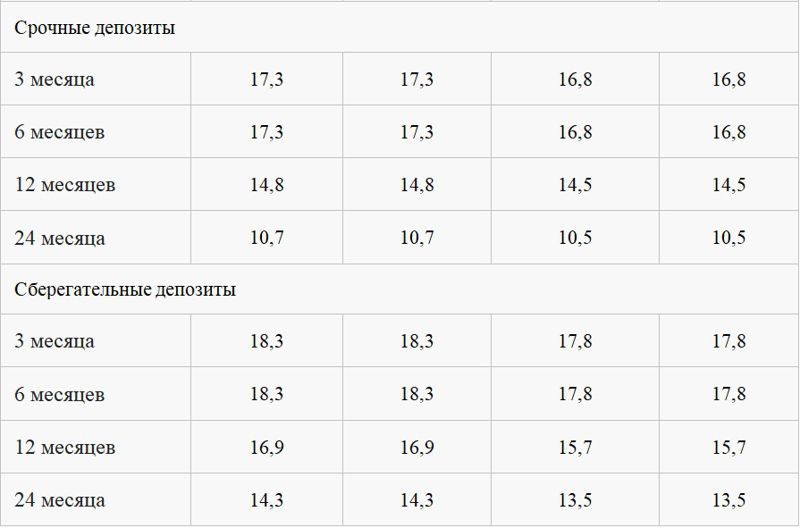 По срочным депозитам на 3 и 6 месяцев без пополнения – 17,3%, на 12 месяцев без пополнения – 14,8% и 24 месяцев без пополнения – 10,7%.