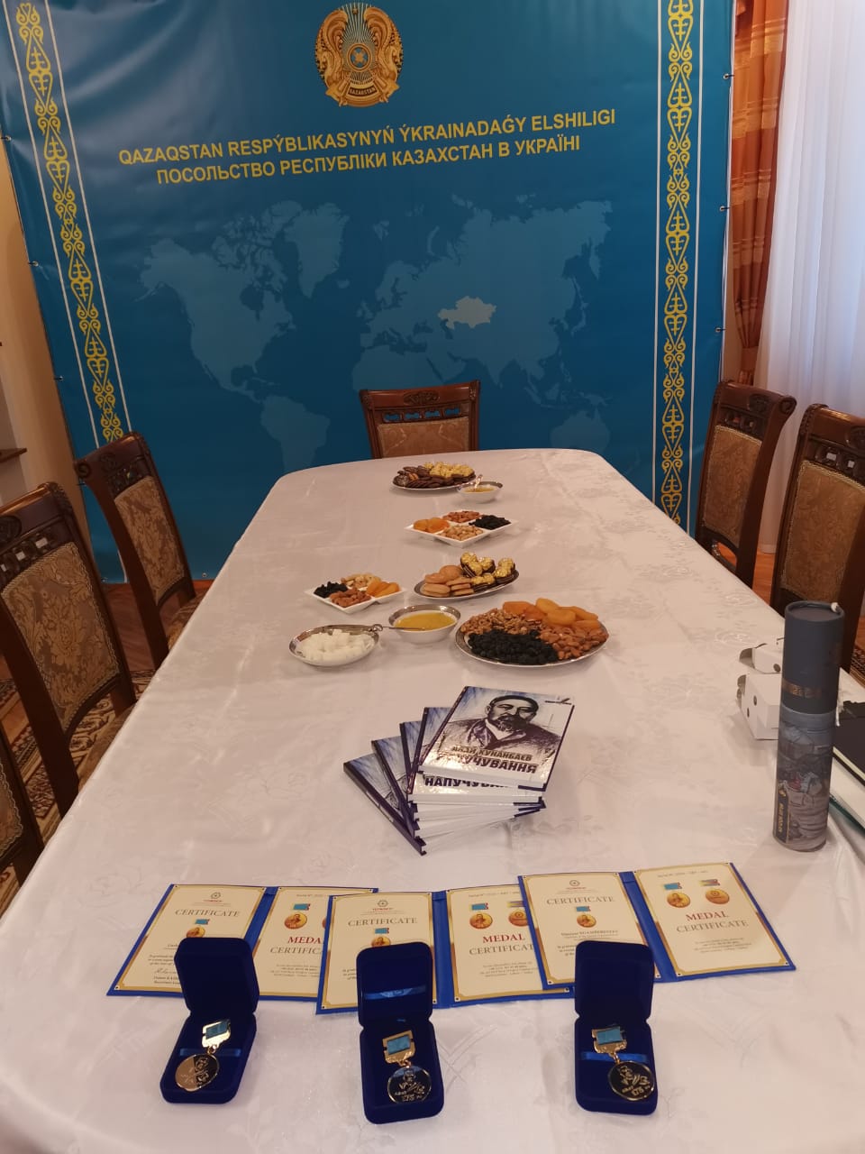 За вклад в развитие популяризации наследия Абая медалями были удостоены переводчик «Слов назиданий» на украинский язык профессор Николай Васькив, председатель Киевского казахского общественного объединения «Достык» Данияр Егамбердиев, почетный консул РК в г.Харьков Эмин Наджафли, а также Посол Казахстана Дархан Калетаев.