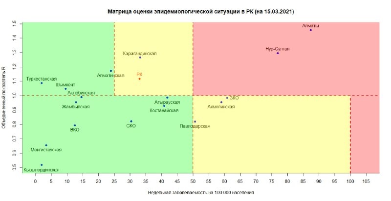 Опубликована матрица оценки эпидемиологической ситуации в регионах Казахстана на 15 марта 2021 года, передает Caravan.kz.