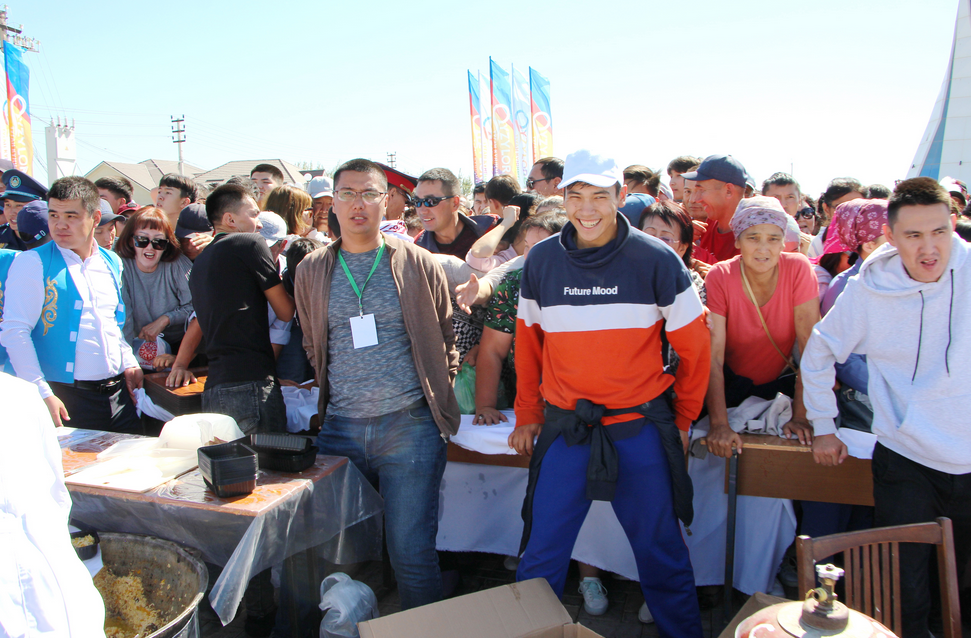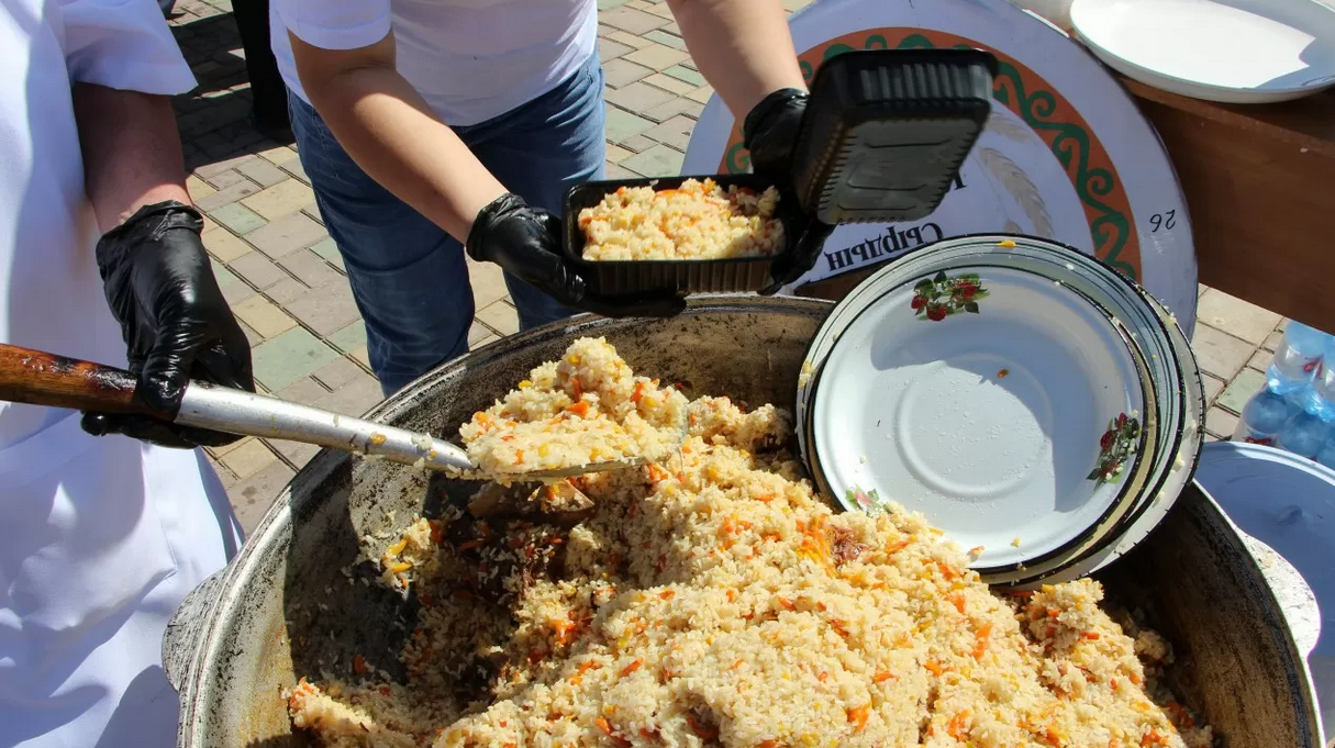 Планировалось, что плов разложат в пластиковую посуду и раздадут людям, чтобы они спокойно поели за столами, которые установили недалеко от башни Сыр ана. Но люди с каждой минутой теряли терпение под жарой. Выдалась солнечная и жаркая погода.