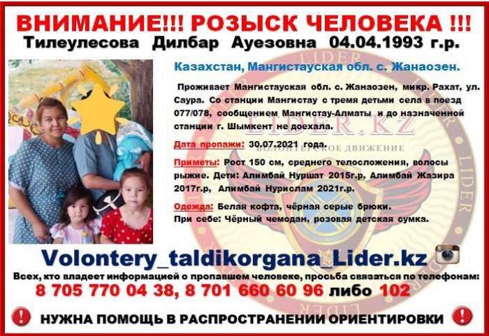 Дилбара Тилеулесова со своими тремя детьми 30 июля текущего года отправилась со станции Мангистау на поезде в Шымкент. Однако по сегодняшний день никаких известий о ее местонахождении нет.