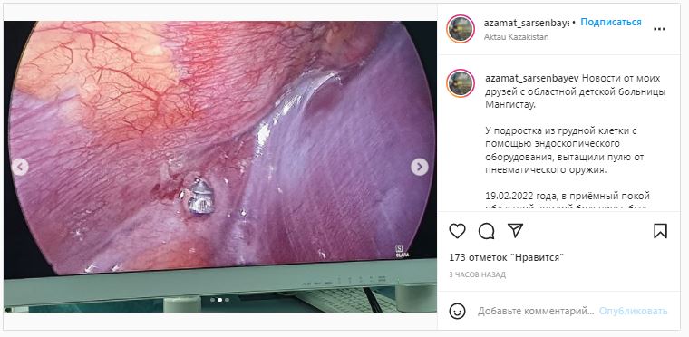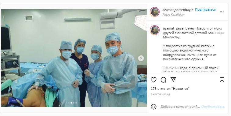 — После полного обследования 22 февраля врачи детской больницы провели сложнейшую операцию по извлечению инородного предмета из грудной клетки подростка, — сказал Азамат Сарсенбаев.