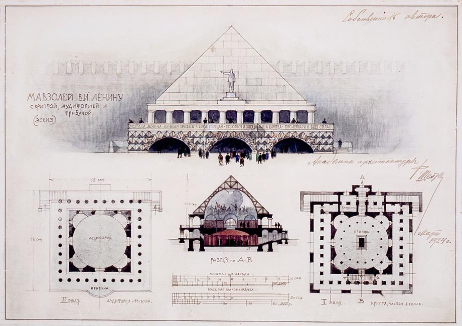 Но комиссии больше понравился проект, вдохновленный вавилонским зикуратом. Первое строение из дерева, появилось на могиле вождя практически сразу, потом его сменило ещё одно, тоже деревянное, но более капитальное сооружение, и лишь к 1930-му, на Красной площади возник всем нам известный мавзолей из мрамора и гранита.