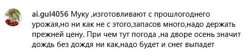 Спрашиваю: в чём причина, почему так выросла цена, ведь рубль на месте, доллар вроде тоже! Объясняют: пшеницу не убрали, будут потери большие! А мы при чём ? Как выживать тем, кто не получает акимовские и депутатские зарплаты?" — написала женщина.
