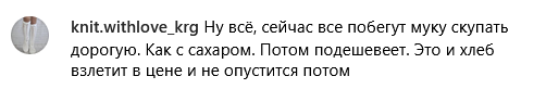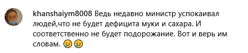 "Добрый день. Сергей, хочу вас попросить опубликовать и задать вопрос соответствующим органам — тем, кто контролирует цены у нас в Караганде! Сегодня приходят торговые представители и все одно и то же говорят: мука подорожала, сахар подорожал!