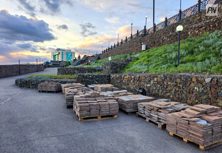 Подрядчик отчитался о пополнении бригады строителей дополнительными силами и завозе брусчатки на верхний и нижний ярусы набережной.
